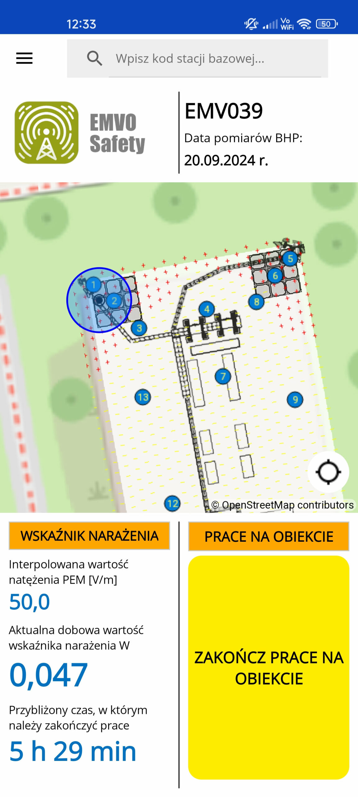Aplikacja EMVO Safety, poprzez rejestrację pozycji użytkownika, na bieżąco aktualizuje osobistą wartość wskaźnika, w oparciu o interpolowaną wartość natężenia pola elektromagnetycznego wyznaczaną na podstawie akredytowanych pomiarów BHP wykonanych na danym obiekcie. Aplikacja zapewnia spełnienie wymogów ww. rozporządzenia w zakresie wykazania tymczasowości narażenia jej użytkownika. Wskazuje także pozostały czas, jaki pozostał użytkownikowi do bezpiecznego przebywania na obiekcie.