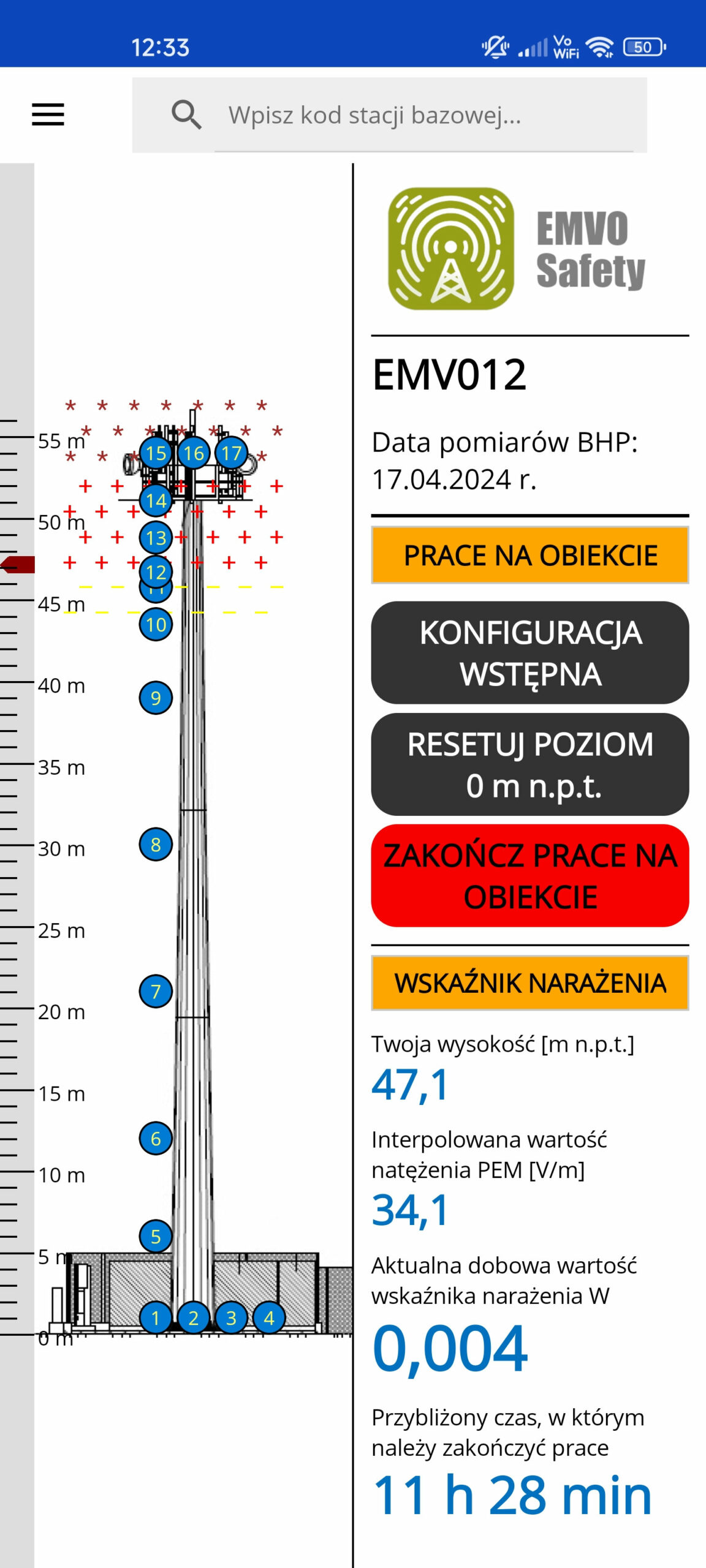 EMVO Safety to kompletne rozwiązanie teleinformatyczne dla ochrony pracowników, podwykonawców oraz użytkowników na obiektach, na których występują systemy antenowe telefonii komórkowej. Aplikacja pełni funkcję informacyjną o aktualnej wartości pola elektromagnetycznego oraz bezpiecznym czasie przebywania w jego otoczeniu.